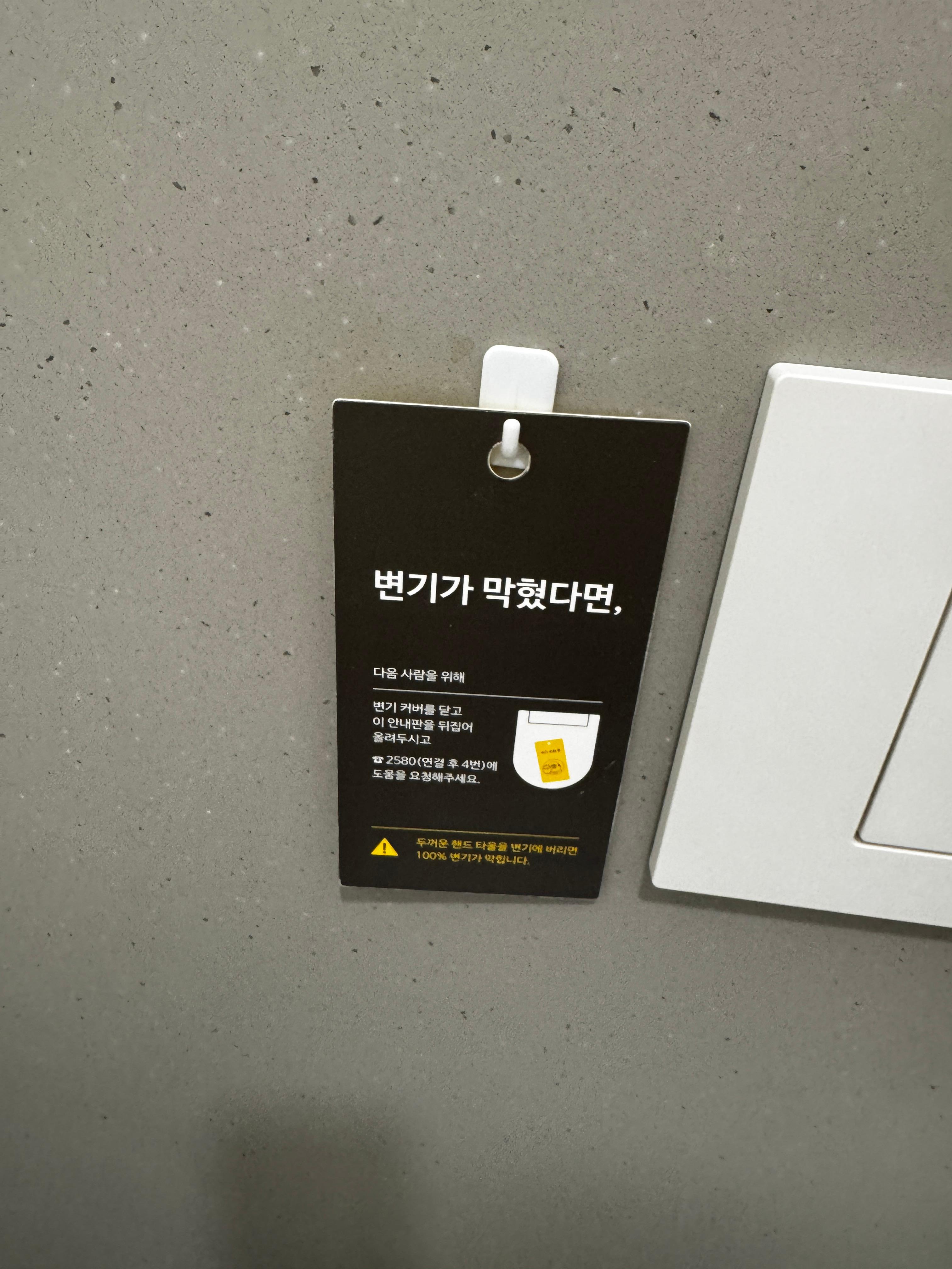 변기가 막혔을 때, 저 카드를 변기 위에 놓아 다른 사람을 배려한다.